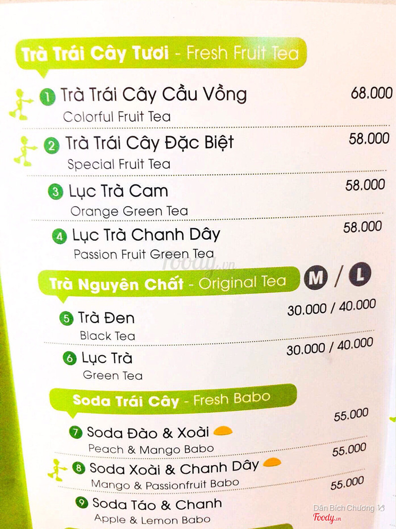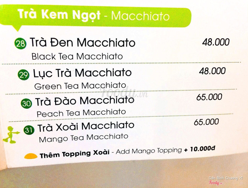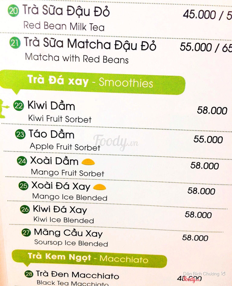 - Trung bình Viết bình luận Thông tin & Bản đồ Báo lỗi vị trí Thời gian hoạt động Chưa mở cửa 09:00 - 22:30 Thích hợp Buổi sáng , Buổi trưa , Buổi xế , Buổi tối Thời gian chuẩn bị Khoảng 5 - 10 phút Nghỉ lễ Các ngày lễ trong năm Thể loại Café/Dessert Sức chứa 30 người lớn Phong cách ẩm thực Món Á , Đài Loan Phù hợp với Hẹn hò , Họp nhóm , Takeaway - Mang về Phục vụ các món Thức uống , Trà sữa Giấy phép/chứng nhận Xem