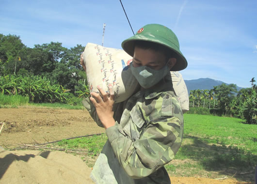 (Cadn.com.vn) - Sáng 27-5, đường vào thôn Hòa Phước (xã Hòa Phú, H. Hòa Vang, Đà Nẵng) nắng nóng hầm hập. Mồ hôi nhễ nhại trên từng khuôn mặt của các chiến sĩ trẻ Đại đội Kho K97 Bộ Chỉ huy Quân sự TP trên công trình giúp dân làm đường bê-tông nông thôn. Mọi công việc được bắt tay từ rất sớm, điểm lấy nước xa, đường lầy cát, nhiều tấm thân trần phơi dưới nắng sàng cát, trộn hồ... Ai cũng đều nêu cao ý thức trách nhiệm nên công việc thật trôi chảy. Sự hiện diện của các anh được nhân dân ghi nhận. “Mệt và vất vả nhưng được góp sức mình thực hiện những việc làm thiết thực giúp bà con nơi đây, chúng em cảm thấy tự hào. Sau này ra quân, chúng em lại có thêm những trải nghiệm thật ý nghĩa trong cuộc đời quân ngũ của mình”, chiến sĩ trẻ Mạc Như Tân với bao xi-măng trên vai, tâm sự.