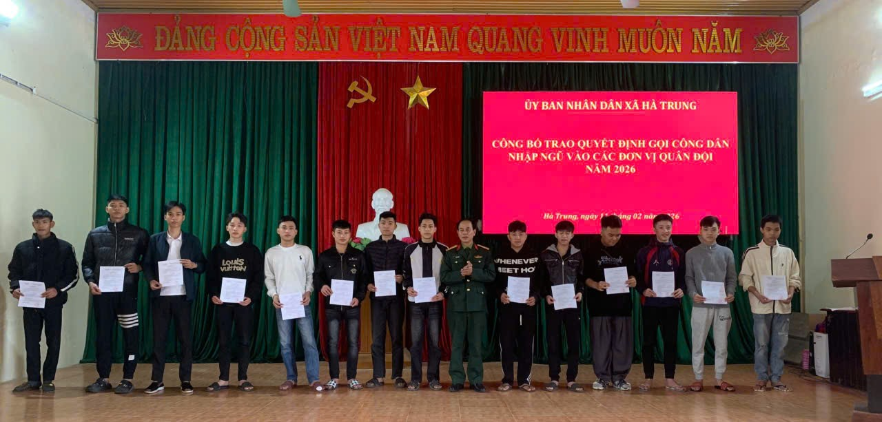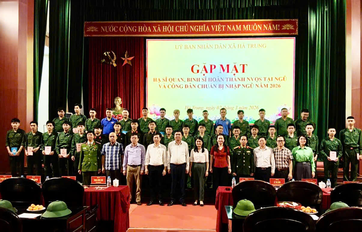 Xã Hà Trung gặp mặt, động viên tân binh lên đường nhập ngũ năm 2026 Chiều ngày 2/3/2026, xã Hà Trung tổ chức lễ gặp mặt, động viên và tặng quà tân binh lên đường nhập ngũ năm 2026, quân nhân hoàn thành nghĩa vụ quân sự trở về địa phương. -