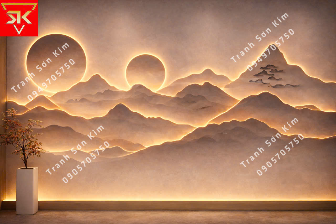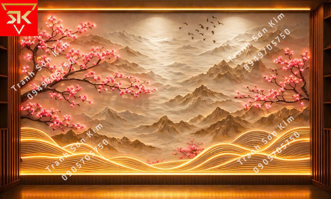 Tranh dán tường điêu khắc 3D – lựa chọn lý tưởng cho không gian phòng VIP nhà hàng sang trọng Trong thiết kế nội thất cao cấp, mỗi chi tiết đều góp phần tạo nên đẳng cấp. Tranh dán tường điêu khắc 3D không chỉ là một tác phẩm nghệ thuật, mà còn là “linh hồn” của không gian. Với hiệu ứng nổi sống động, từng đường nét núi non, mặt trời, thác nước hay cành đào được khắc họa tinh xảo, tạo nên chiều sâu thị giác và cảm xúc. Không gian phòng VIP trở nên ấm cúng, sang trọng nhưng vẫn đậm chất nghệ thuật Á Đông. Đây là sự kết hợp hoàn hảo giữa thẩm mỹ hiện đại và giá trị phong thủy, mang đến cảm giác thư thái, đẳng cấp cho thực khách ngay từ ánh nhìn đầu tiên.