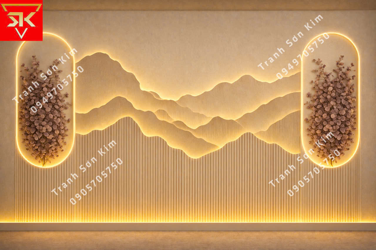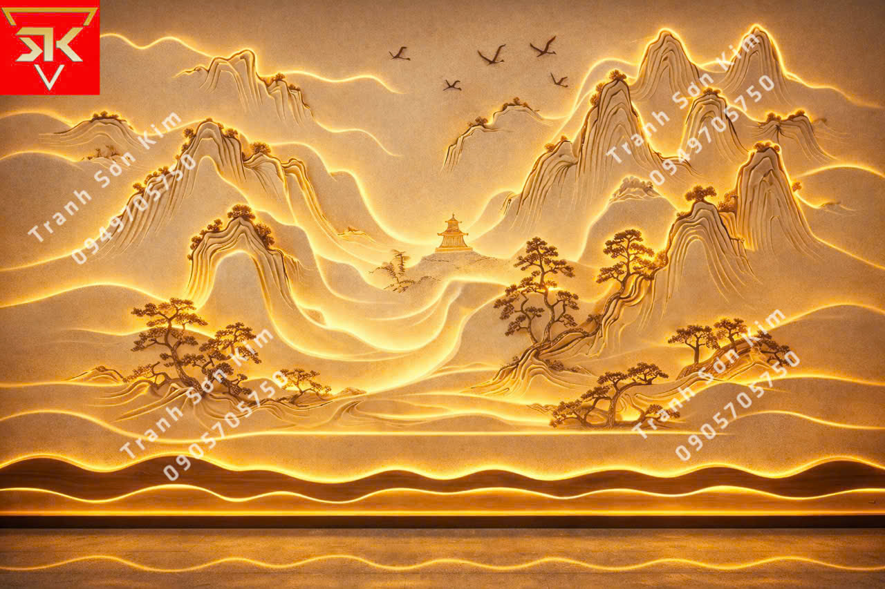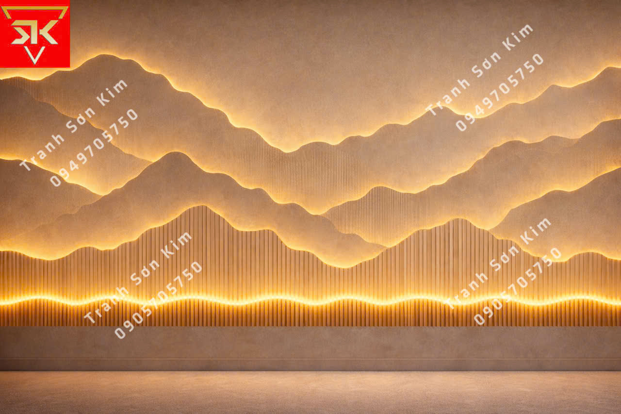 Thi công tranh dán tường điêu khắc đồi núi vàng ánh kim cho phòng khách