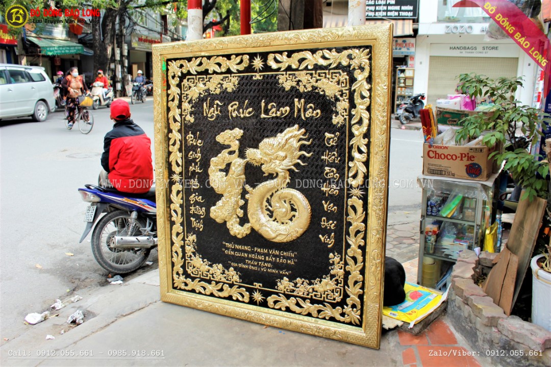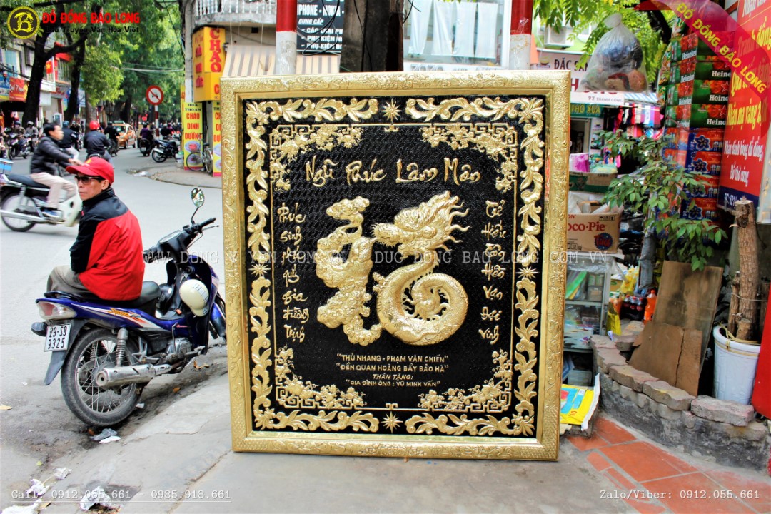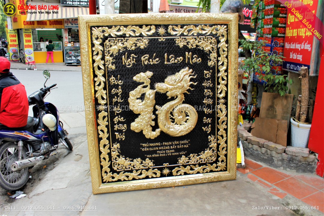 Tranh chữ Phúc hóa rồng phượng 1m67x1m47 khung liền đồng hàng đặt chạm tay thủ công bằng đồng vàng dày 1ly xương inox cho đền ông hoàng bảy ở Bảo Hà Lào cai