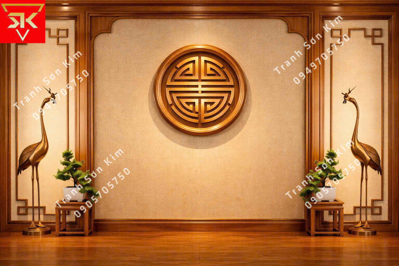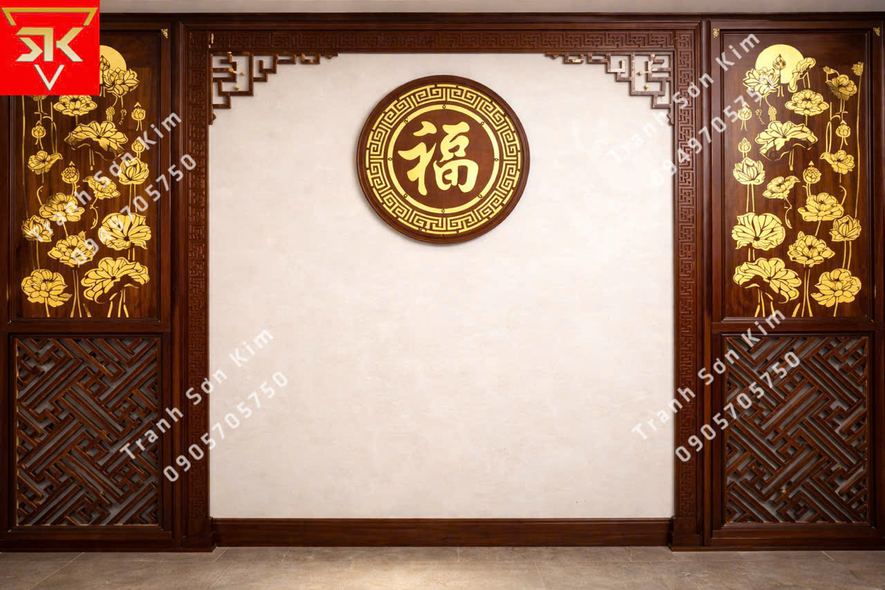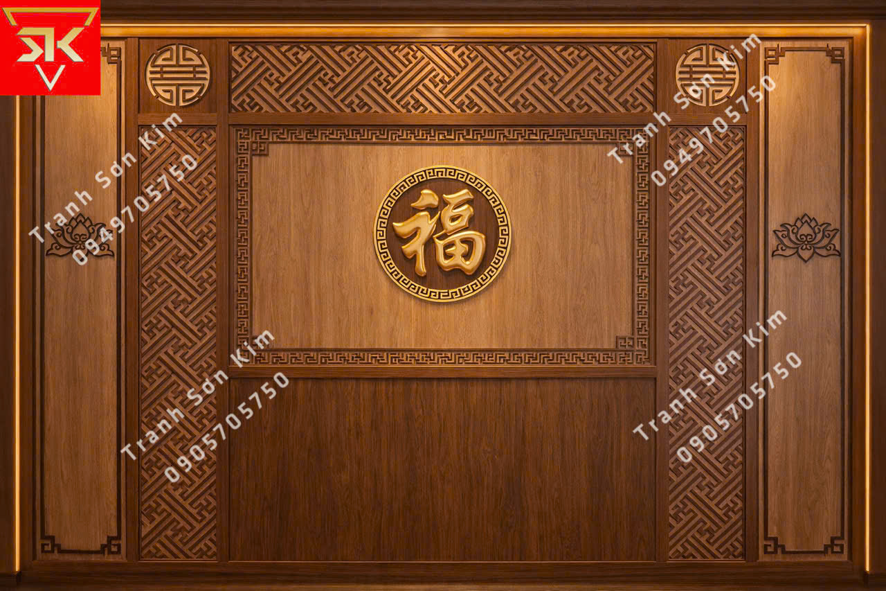 Thi công tranh dán tường chữ phúc điêu khắc gỗ cho phòng thờ nhà biệt thự phố