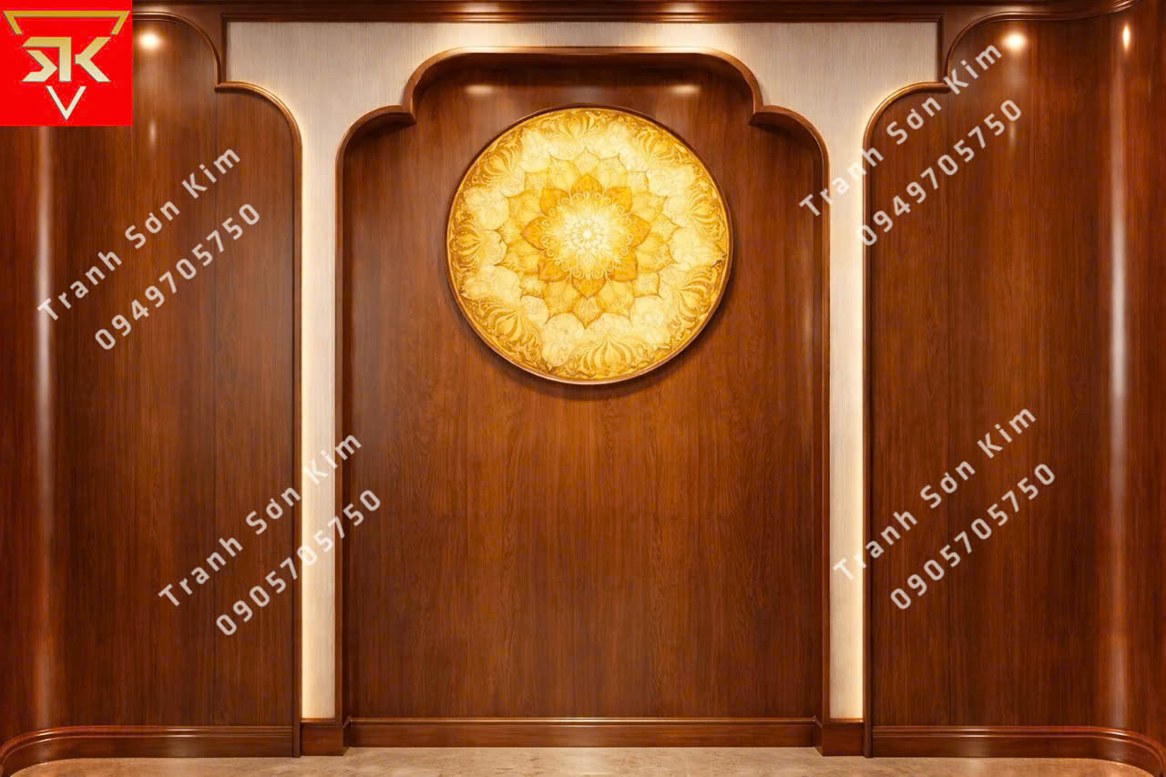Bức tranh hoa sen nền nâu được trang trí trong không gian phòng thờ mang đến một vẻ đẹp trang nghiêm, thanh tịnh và đầy tính nghệ thuật. Với tông màu nâu trầm làm chủ đạo, bức tranh tạo cảm giác ấm áp, tĩnh lặng, giúp tâm hồn người nhìn dễ dàng an yên và tịnh tâm hơn trong không gian thờ tự linh thiêng. Những đóa sen vàng nở rộ rực rỡ, kết hợp với hình ảnh chim én bay lượn, gợi lên sự thanh cao, thuần khiết và tinh thần giác ngộ trong đạo Phật.
