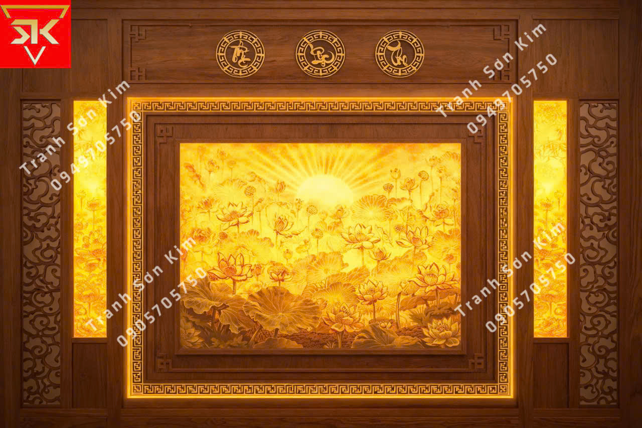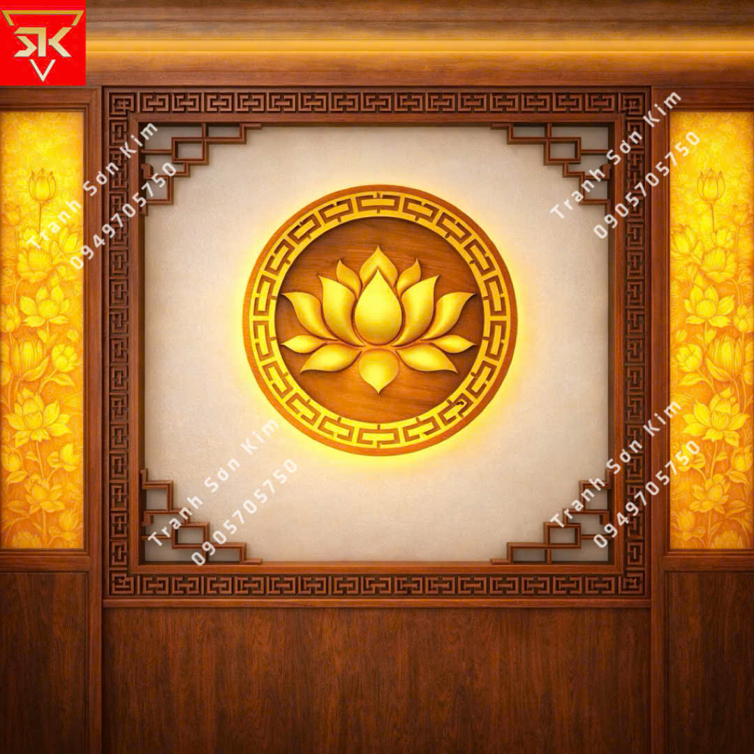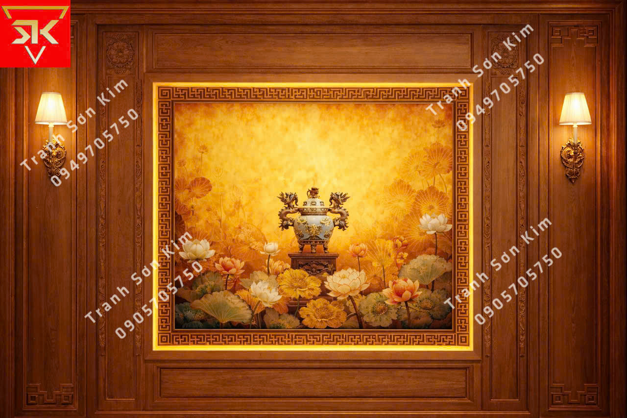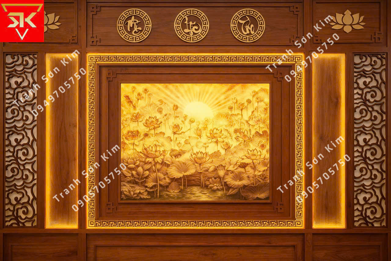 Hoa sen từ lâu đã là biểu tượng của sự tinh khiết, trí tuệ và lòng từ bi trong văn hóa Phật giáo. Khi được chọn làm họa tiết trang trí cho phòng thờ, hoa sen không chỉ làm đẹp cho không gian mà còn mang ý nghĩa sâu sắc: nhắc nhở con cháu luôn giữ gìn tâm thiện lành, sống hướng thiện và gìn giữ truyền thống tâm linh của gia đình. Bức tranh không đơn thuần là một tác phẩm nghệ thuật, mà còn là biểu tượng tâm linh giúp gia chủ giữ vững niềm tin, an trú nội tâm và kết nối với thế giới tâm linh một cách trang trọng, ý nghĩa.