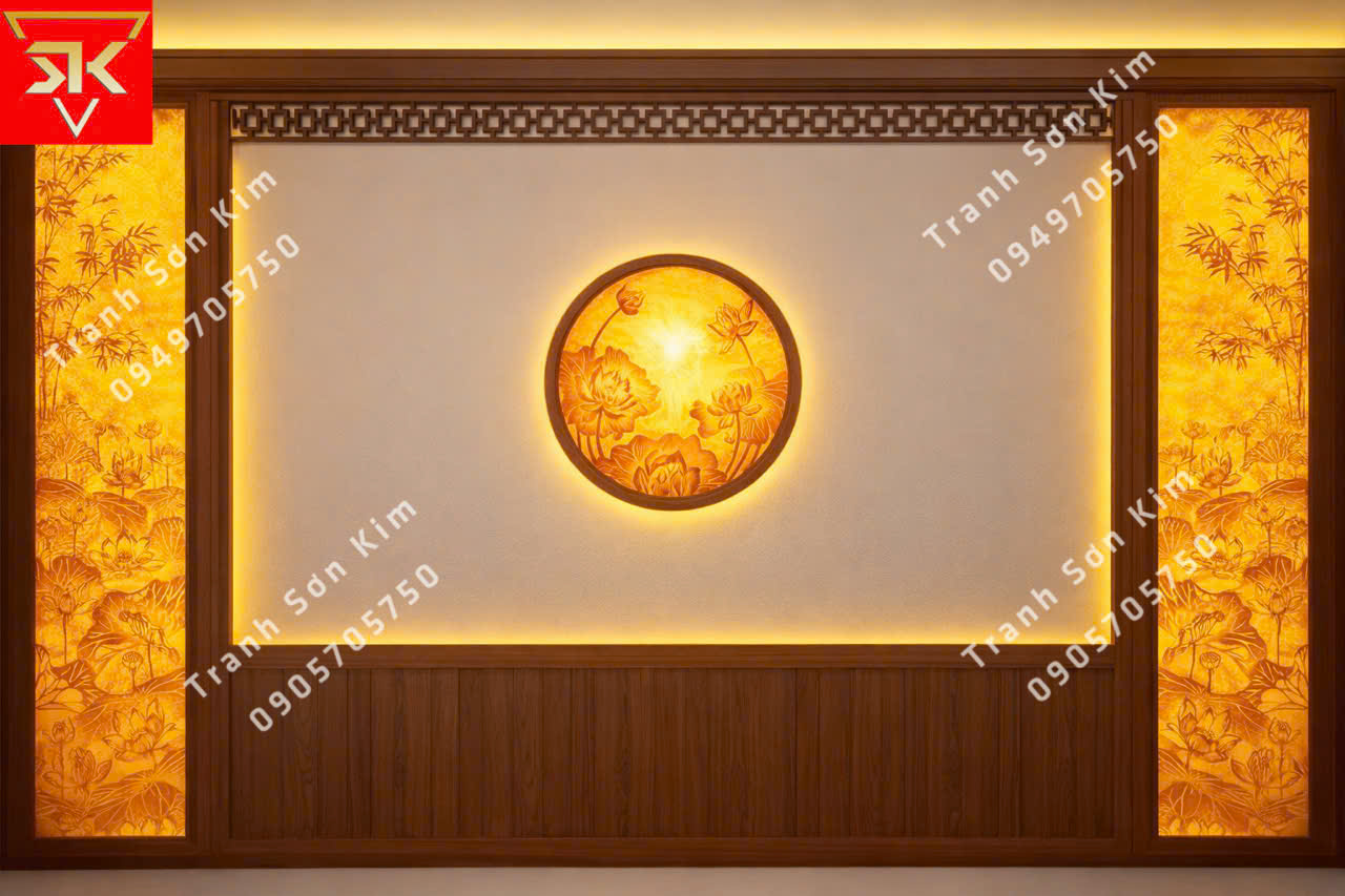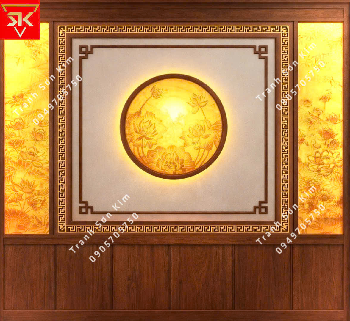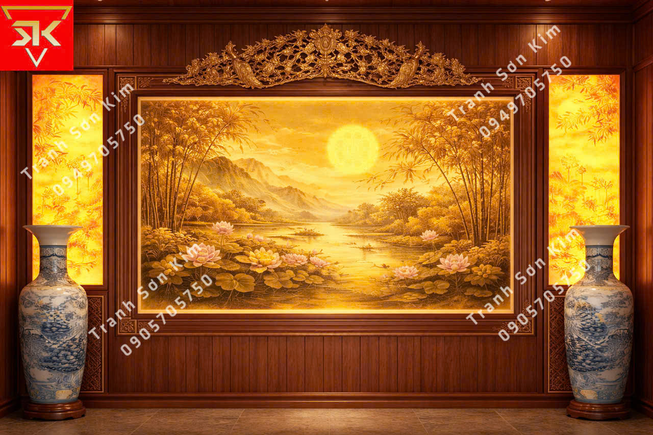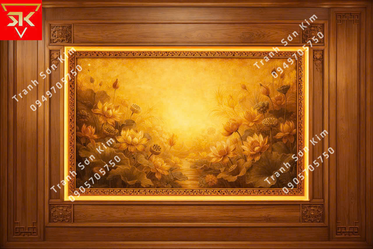 Hoa sen từ lâu đã là biểu tượng của sự tinh khiết, trí tuệ và lòng từ bi trong văn hóa Phật giáo. Khi được chọn làm họa tiết trang trí cho phòng thờ, hoa sen không chỉ làm đẹp cho không gian mà còn mang ý nghĩa sâu sắc: nhắc nhở con cháu luôn giữ gìn tâm thiện lành, sống hướng thiện và gìn giữ truyền thống tâm linh của gia đình. Bức tranh không đơn thuần là một tác phẩm nghệ thuật, mà còn là biểu tượng tâm linh giúp gia chủ giữ vững niềm tin, an trú nội tâm và kết nối với thế giới tâm linh một cách trang trọng, ý nghĩa.