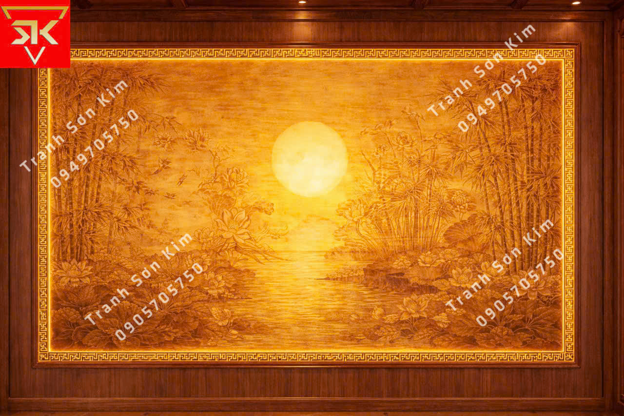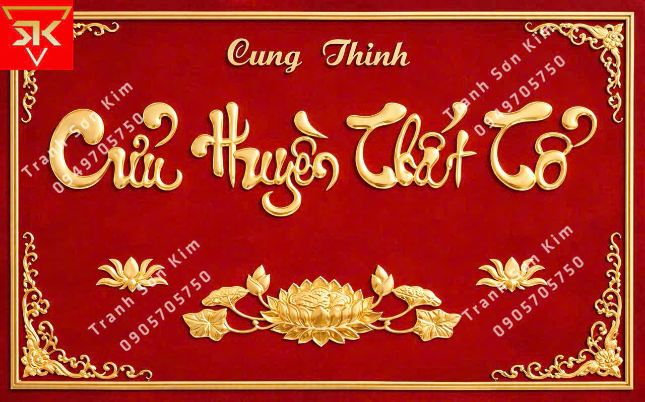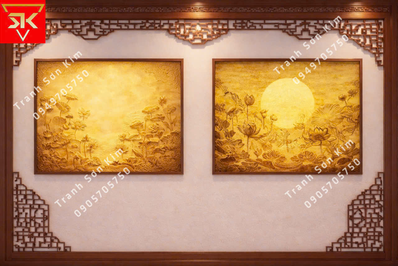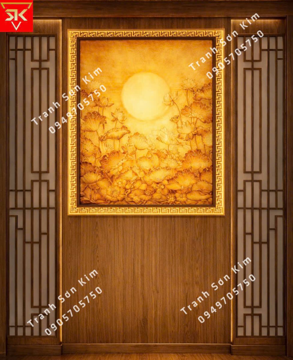 Hoa sen từ lâu đã là biểu tượng của sự tinh khiết, trí tuệ và lòng từ bi trong văn hóa Phật giáo. Khi được chọn làm họa tiết trang trí cho phòng thờ, hoa sen không chỉ làm đẹp cho không gian mà còn mang ý nghĩa sâu sắc: nhắc nhở con cháu luôn giữ gìn tâm thiện lành, sống hướng thiện và gìn giữ truyền thống tâm linh của gia đình. Bức tranh không đơn thuần là một tác phẩm nghệ thuật, mà còn là biểu tượng tâm linh giúp gia chủ giữ vững niềm tin, an trú nội tâm và kết nối với thế giới tâm linh một cách trang trọng, ý nghĩa.