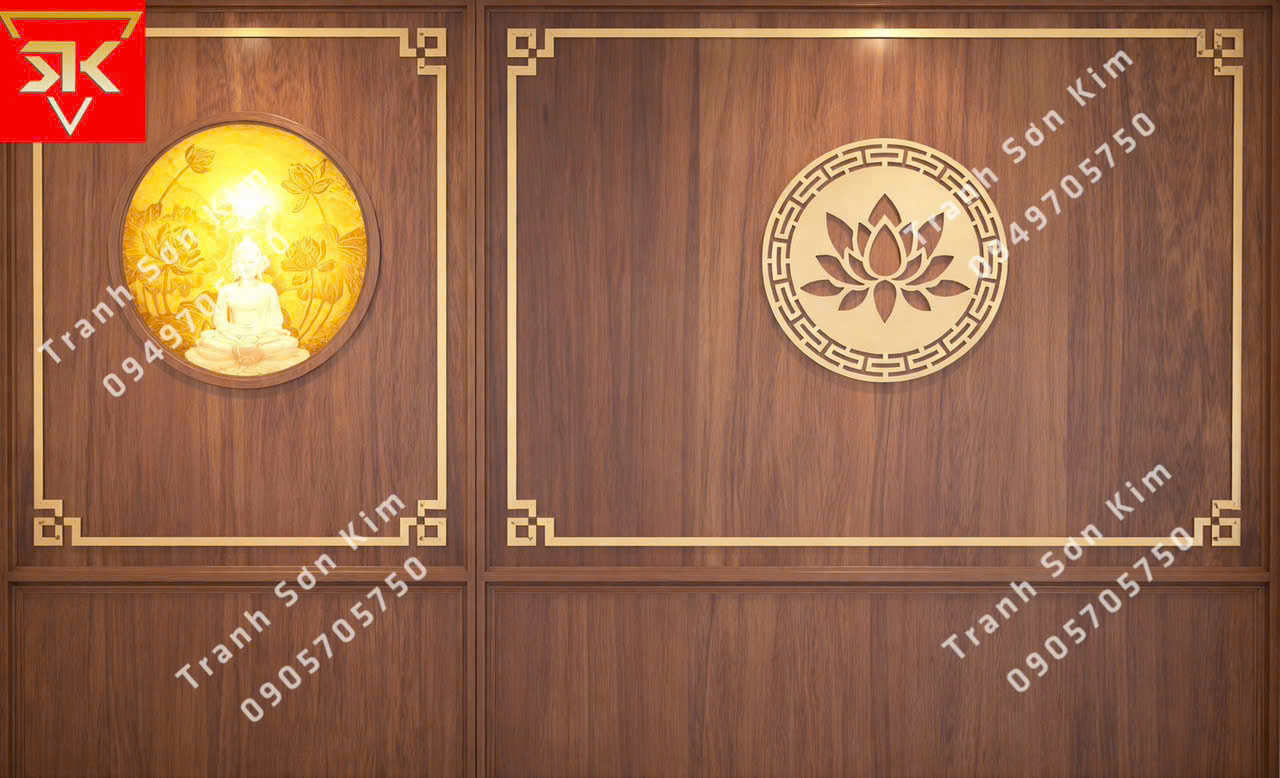 Bức tranh bên trái hình ảnh Đức Phật ngồi thiền trên đài sen, phía sau đức Phật là mặt trời tỏa sáng, tạo ra một hào quang rực rỡ bao quanh, cảnh nền núi non và mặt nước yên tĩnh, tạo nên một khung cảnh thiên nhiên biểu tượng cho sự thiền định và sự giác ngộ. Bức tranh bên phải hỉnh ảnh Đức Phật được chạm khắc tinh xảo với các hoa văn truyền thống và các đường nét hoa sen mềm mại nét mặt an nhiên, đôi mắt nhắm nhẹ, biểu lộ sự bình yên và trí tuệ sâu sắc. Mẫu tranh dán tường Đức Phật trang trí không gian phòng thờ, phòng thiền định với nền gỗ ấm áp và trang trọng, ánh sáng dịu nhẹ từ trên trần nhà, tạo nên một không gian thanh tịnh, thích hợp cho việc thờ cúng và thiền định.