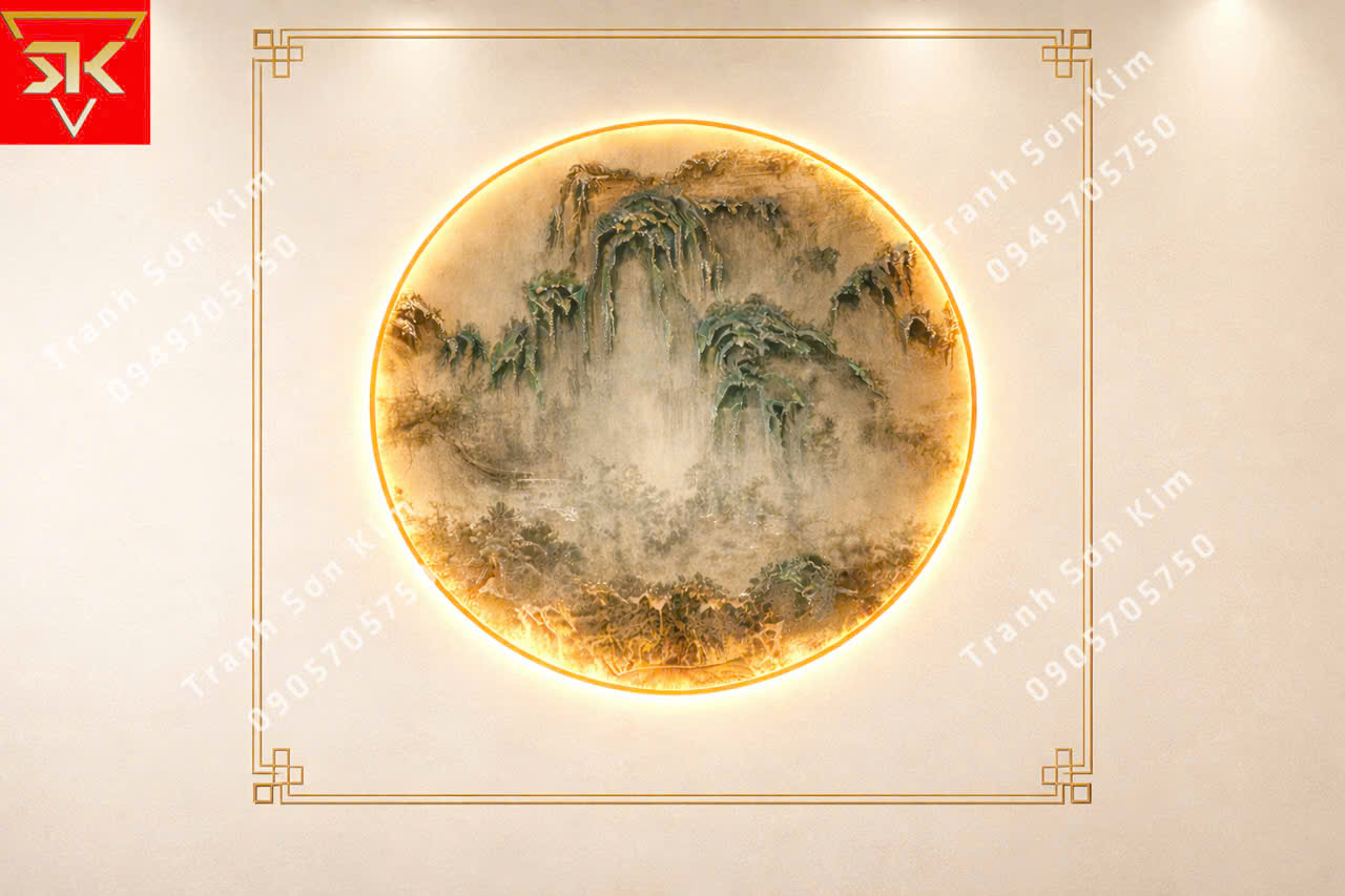 Tranh dán tường lam sóng màu vàng kim với sự chuyển động của gió hoặc nước được thiết kế đẹp mắt đầy tính nghệ thuật trang trí căn phòng spa, gội đầu dưỡng sinh. Bức tranh dán tường thủy mặc có phong cảnh núi non thanh bình yên tĩnh. Những ngọn núi dường như bị bao phủ một lớp trong sương mù với tone màu xanh lam và xanh lục, một chiếc thuyền nhỏ trên hồ, cặp hươu vàng đang nhảy tung tăng tạo thêm nét hoang dã cho khung cảnh thanh bình tất cả đều gói gọn trong hình tròn trung tâm mà Sơn Kim ý tưởng dựa trên đề tài tranh dán tường lam sóng mà khách hàng yêu cầu.