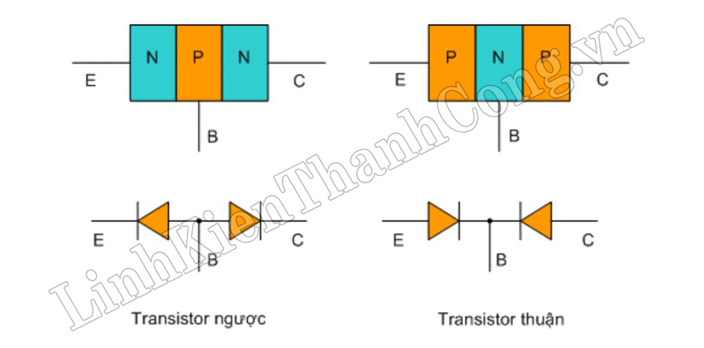- Transistor là linh kiện được cấu tạo từ các lớp bán dẫn NPN (Ngược) và PNP (Thuận)