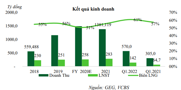 VCBS dự phóng doanh thu năm 2022 của GEG đạt 2,037 tỷ đồng (tăng 48%), lãi ròng đạt 386 tỷ đồng (tăng 36%). EPS đạt 1,198 đồng/cổ phiếu, P/E forward ở mức 18.11 lần. Theo đó, khuyến nghị mua đối với GEG với giá mục tiêu đạt 29,800 đồng/cổ phiếu.