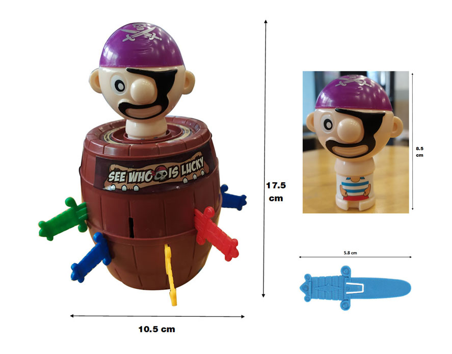 * Sản phẩm bao gồm:- 1 thùng rượu - 1 chú hải tặc- 16 thanh kiếm (đỏ x 4 thanh, vàng x 4 thanh, xanh lá x 4 thanh, xanh dương x 4 thanh)- Vòng quay thưởng phạt dưới đáy thùng (kèm ô trống để bạn tạo thêm hình phạt riêng cho nhóm mình)