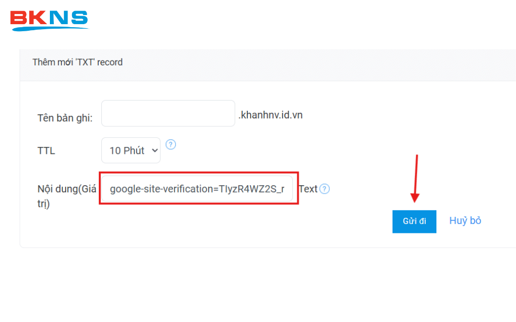 Truy cập trang quản lý DNS của nhà cung cấp tên miền và thêm bản ghi TXT chứa chuỗi mã xác minh mà Google đã cung cấp. Sau khi thêm, hãy lưu thay đổi.