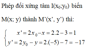 Trong mặt phẳng Oxy cho điểm I(2; -5). Phép đối xứng tâm I biến M(x; y) thành M'(3; 7). Tọa độ của M là: