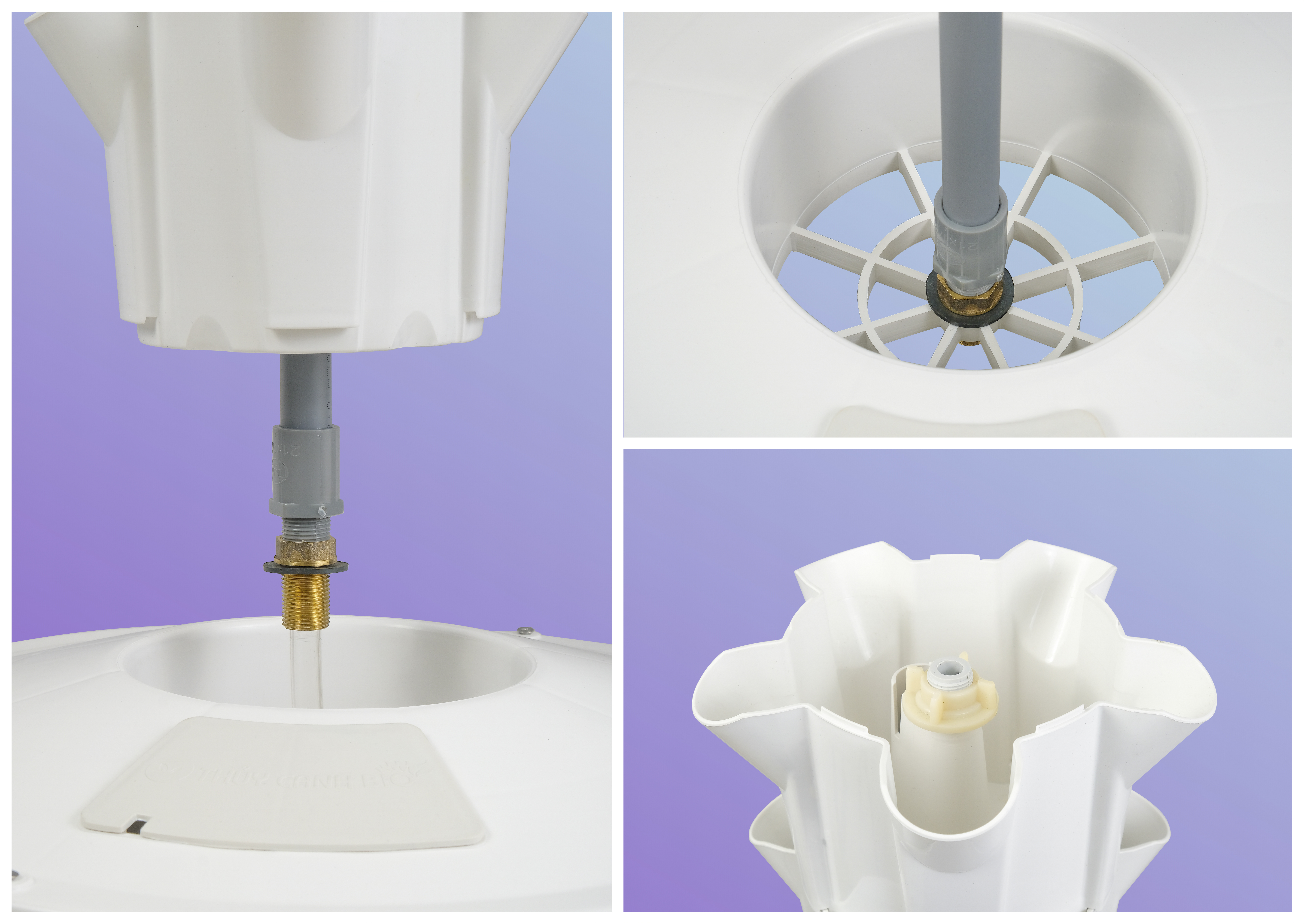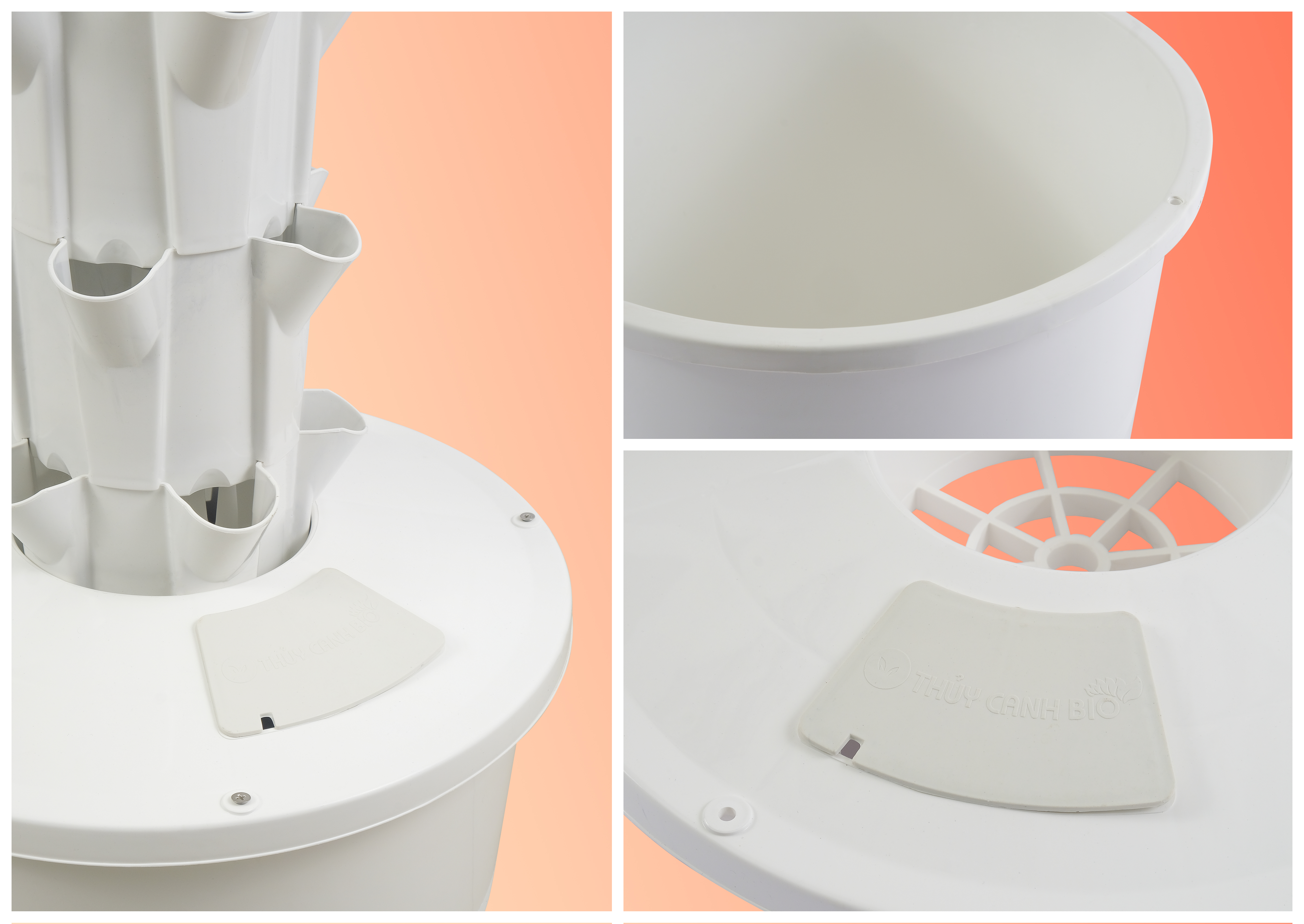 - Các hốc trồng được bố trí đều trên thân trụ. Bên trọng trụ sẽ là hệ thống dẫn truyền dung dịch thủy canh. Các đốt trụ chứa nước giúp cây sống tốt hơn khi mất điện hoặc gặp sự cố về bơm