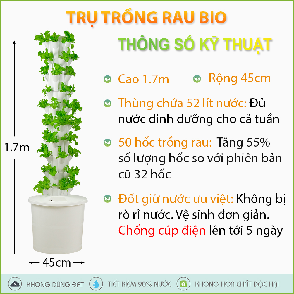 Trụ trồng rau khí canh do Thủy Canh Bio sản xuất gồm 40 hốc trồng rau, tăng 25% năng suất trồng rau so với phiên bản 32 hốc cũ. Với chiều cao 1m85, phù hợp với mọi tầm với vóc dáng của người Việt Nam. Dung tích chứa nước lớn, lên đến 52 lít nước, nên 1 tuần chỉ cần châm nước và dinh dưỡng 1-2 lần, giúp tiết kiệm thời gian chăm sóc đi đáng kể.