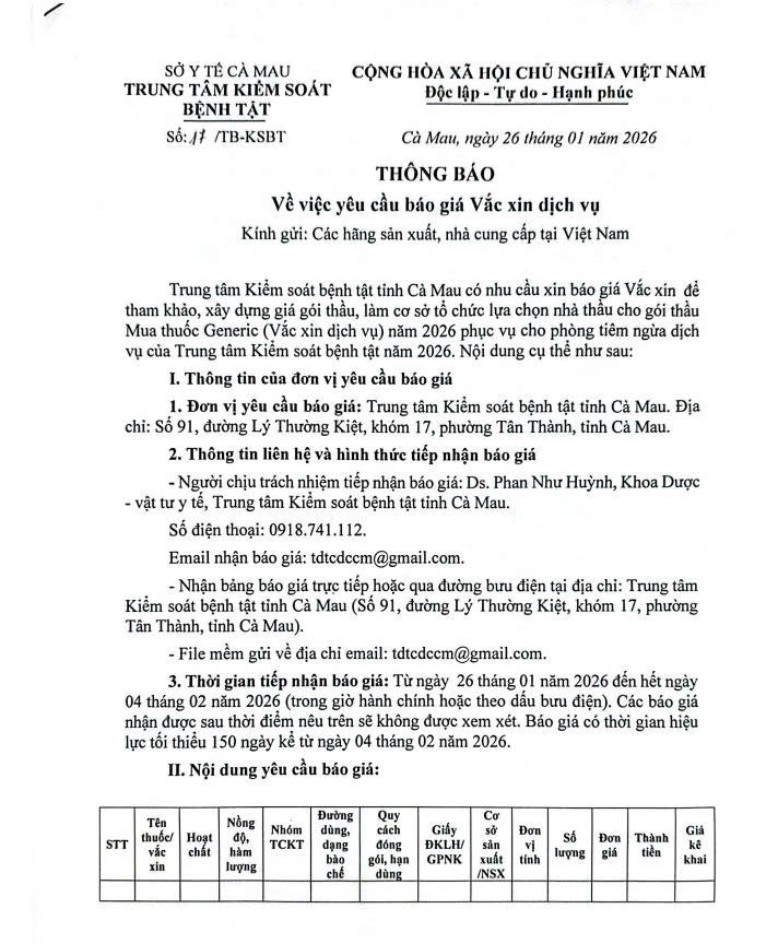 Thông báo về việc yêu cầu báo giá Vắc xin dịch vụ