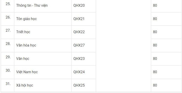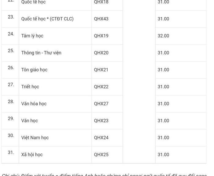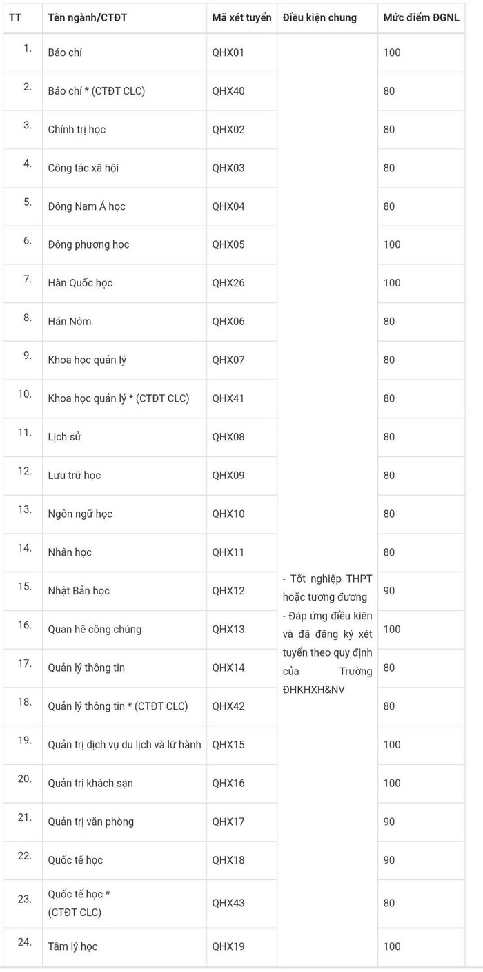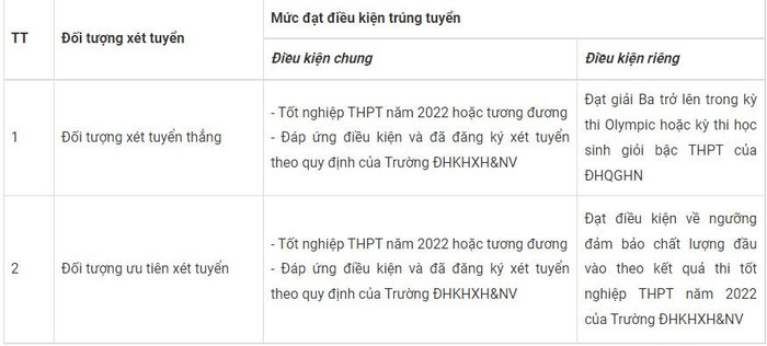 Trường Đại học Khoa học Xã hội và Nhân văn (Đại học Quốc gia Hà Nội) thông báo điểm chuẩn 4 phương thức tuyển sinh 301, 303, 401, 409 của trường.Theo đó, mức đạt điều kiện trúng tuyển với phương thức 301 (xét tuyển thẳng và ưu tiên xét tuyển theo quy chế tuyển sinh của Bộ Giáo dục và Đào tạo), cụ thể như sau: