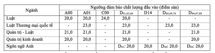 Theo đó, điểm nhận hồ sơ xét tuyển (điểm sàn) theo kết quả thi tốt nghiệp trung học phổ thông năm 2022 vào các ngành dao động là từ 20 đến 24, tuỳ ngành và tổ hợp xét tuyển.