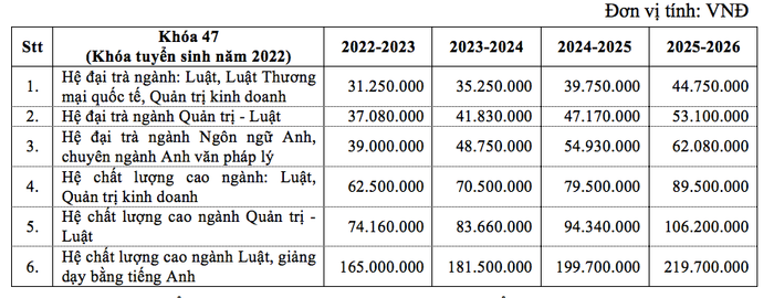 Đặc biệt, Trường Đại học Luật Thành phố Hồ Chí Minh cũng thông tin về học phí năm học 2022-2023 và lộ trình đến năm học 2025-2026.