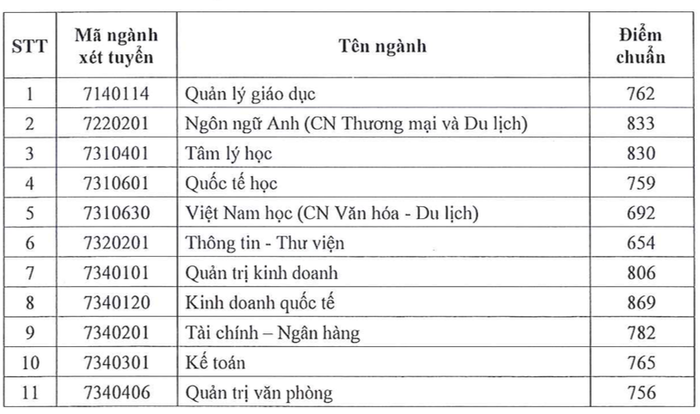 Bên cạnh đó, nhà trường cũng công bố điểm chuẩn trúng tuyển (trừ điều kiện tốt nghiệp trung học phổ thông) đối với phương thức tổng hợp. Theo đó, cả chương trình đại học chính quy chất lượng và chương trình đại học chính quy quốc tế song bằng đều lấy điểm chuẩn trúng tuyển là 109.