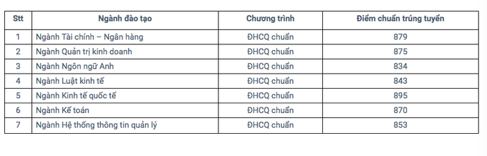 Điểm chuẩn trúng tuyển đã bao gồm điểm ưu tiên khu vực và đối tượng theo quy định. Đối với chương trình đại học chính quy chất lượng cao, sinh viên sẽ chọn ngành (Tài chính ngân hàng, Quản trị kinh doanh, Kế toán) sau khi nhập học chính thức.
