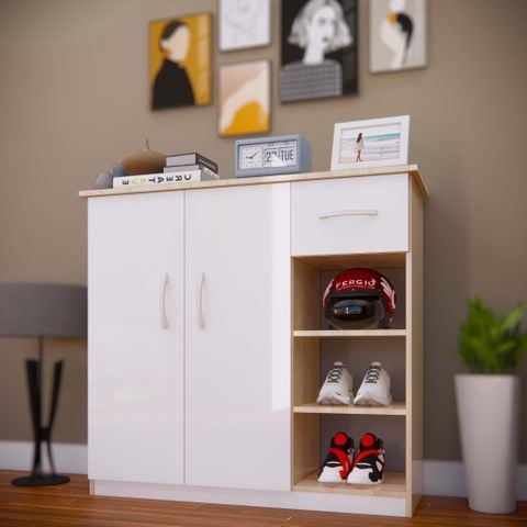 Tủ giày TG126 - 4 cánh, 1 ngăn kéo, ô hở dưới, khung sồi cánh trắng