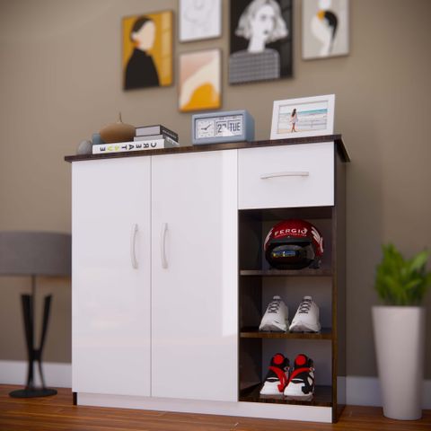 Tủ giầy nhựa TG96A - 2 cánh dài, 1 ngăn kéo, ô hở phải, khung óc chó mặt trắng