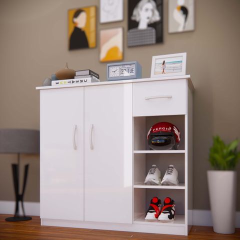 Tủ giày TG126 - 4 cánh, 1 ngăn kéo, ô hở dưới, trắng