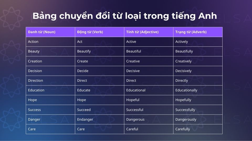 | STT | Danh từ (Noun) | Động từ (Verb) | Tính từ (Adjective) |