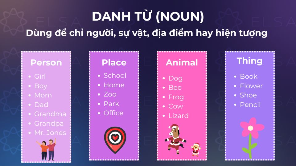 Danh từ (Noun) là từ dùng để chỉ người, sự vật, địa điểm hay hiện tượng nào đó. Ví dụ: house, cat, flower, book,…