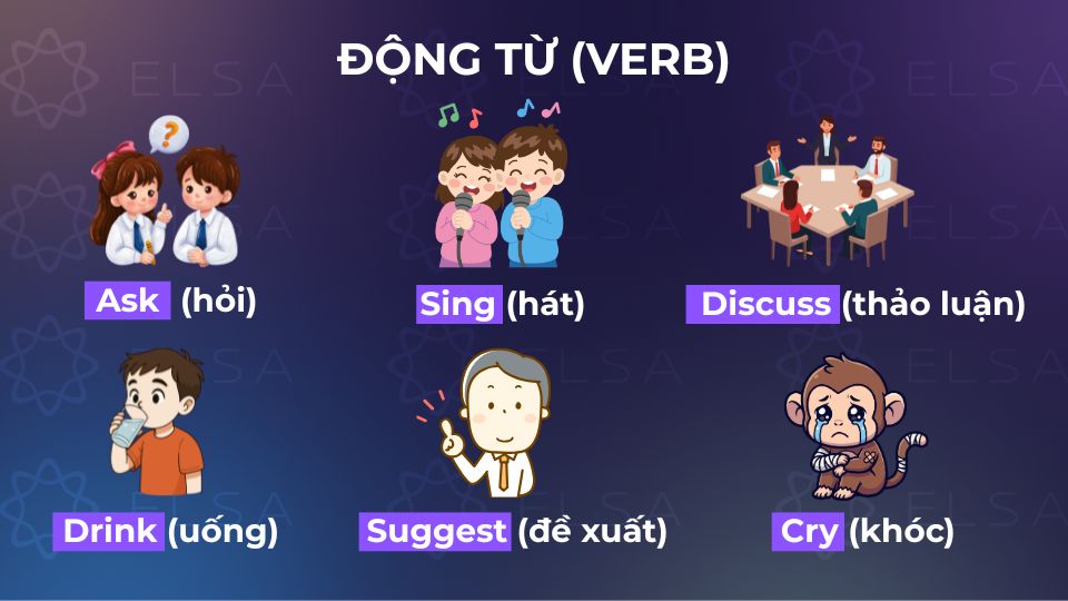 Động từ (Verb) trong tiếng Anh dùng để diễn tả hành động, cảm xúc hoặc tình trạng của chủ thể. Ví dụ: ask (hỏi), suggest (đề xuất), discuss (thảo luận),…