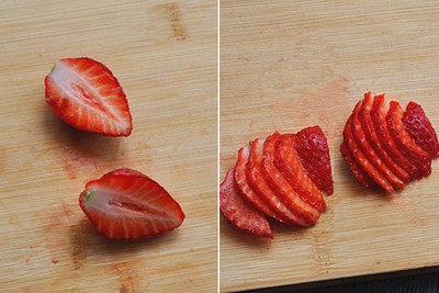 Phần dâu tây còn lại đem cắt miếng vừa ăn để lát thả vào trà ăn cùng trong lúc uống. Tương tự với chanh cũng đem cắt các khoanh tròn mỏng để thả vào trang trí và gia tăng độ thơm cho trà.
