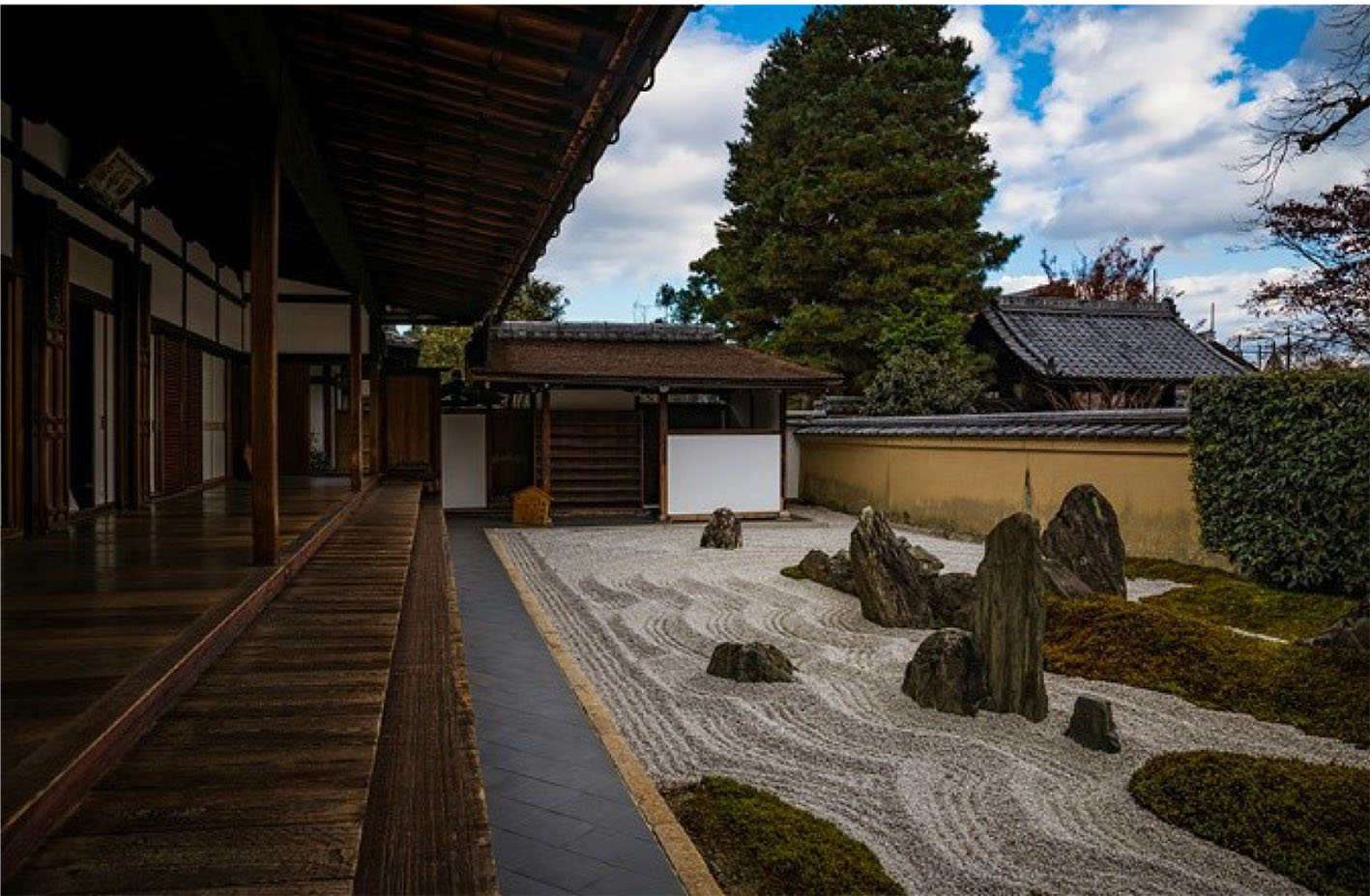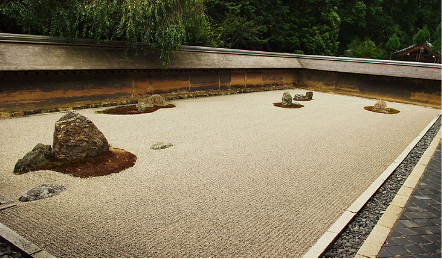 Khái niệm “trống rỗng” thâm nhập vào Phật giáo một cách hữu cơ, và ở Nhật Bản ảnh hưởng của nó đã được thể hiện rõ ràng trong các khu vườn tượng trưng và trừu tượng của giáo lý “thiền” [5]. Dựa trên các thực hành thiền định, trong tâm trí, con người có thể tạo ra bất kỳ hình ảnh nào trong không gian “trống rỗng”, mà không cần đến các hóa thân thực sự của chúng trong tự nhiên. Điều đó đã tạo nên những kiệt tác nghệ thuật làm vườn của Phật giáo Thiền tông như khu vườn đá của ngôi đền Reanji và ngôi đền Daitokuji ở Kyoto, Nhật Bản (ảnh 2a, 2b), khiến cả thế giới phải khâm phục.