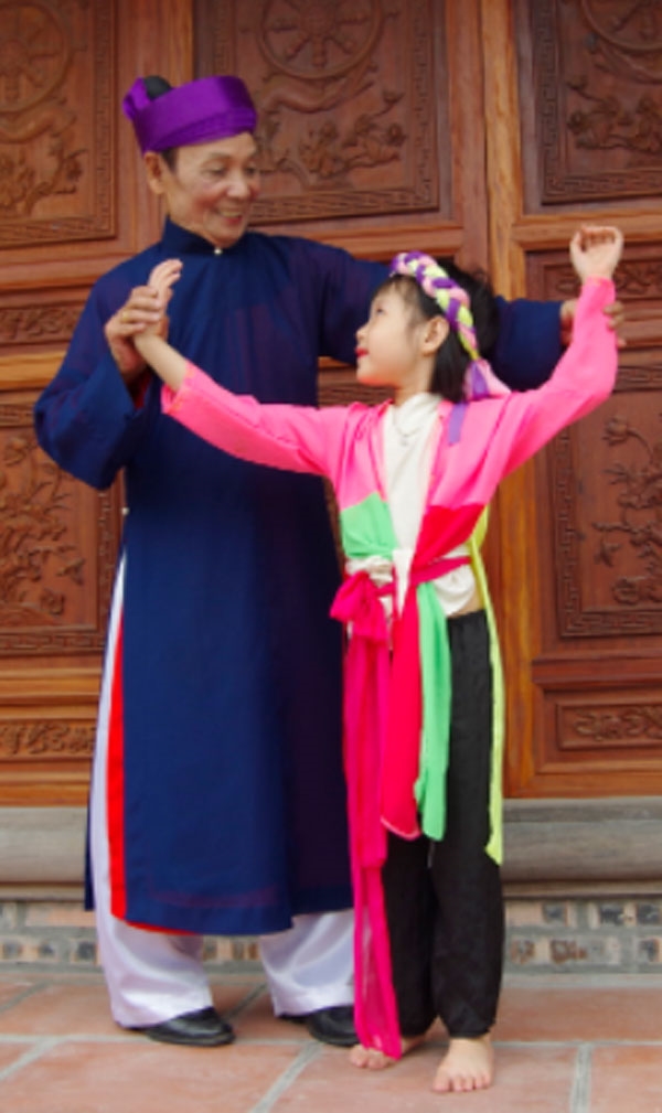 | Nghệ nhân Nguyễn Tuấn Tú truyền dạy hát chèo cho trẻ em. |
