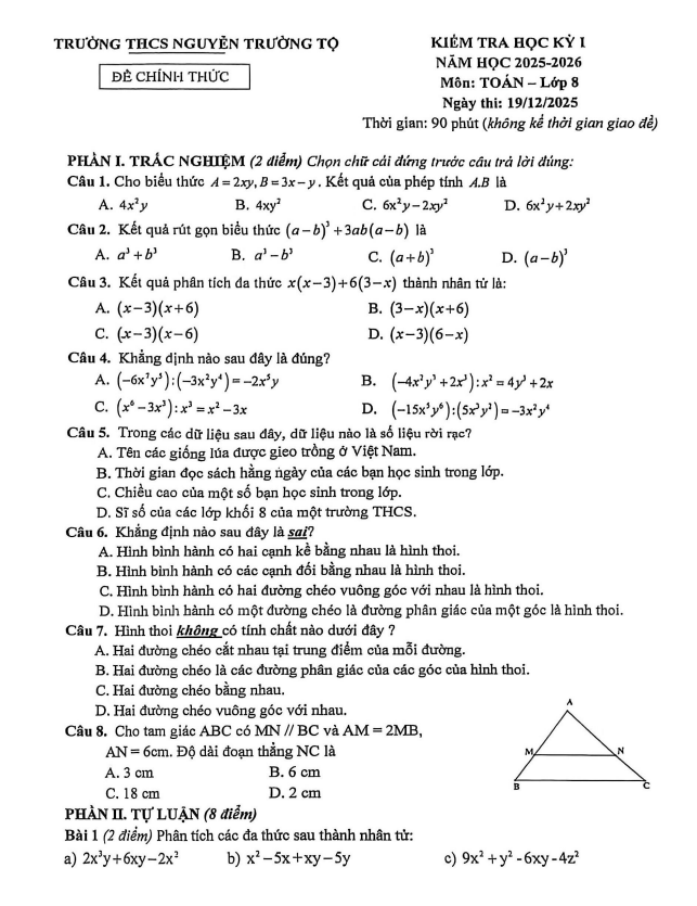 Đề học kỳ 1 Toán 8 năm 2025 – 2026 trường THCS Nguyễn Trường Tộ – Hà Nội 20/12/2025