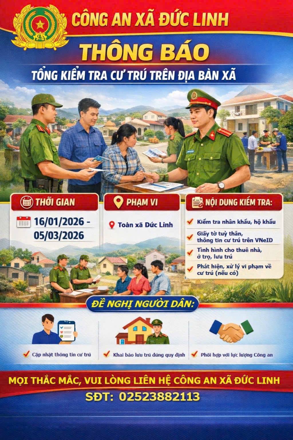 CÔNG AN XÃ ĐỨC LINH THÔNG BÁO VỀ VIỆC TỔNG KIỂM TRA CƯ TRÚ TRÊN ĐỊA BÀN