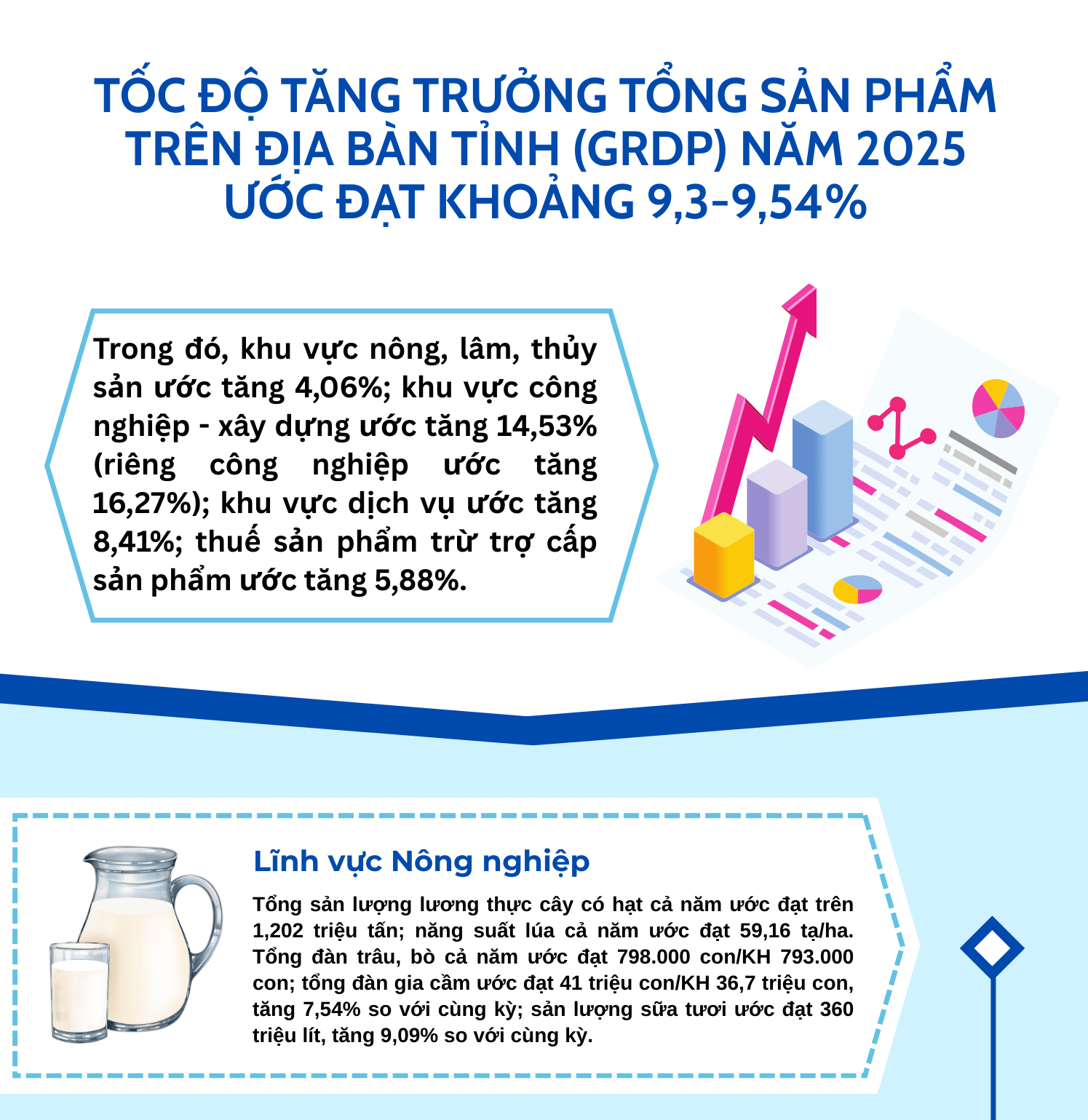 [Infographics]: Tốc độ tăng trưởng tổng sản phẩm trên địa bàn tỉnh (GRDP) năm 2025 ước đạt khoảng 9,3-9,54% -