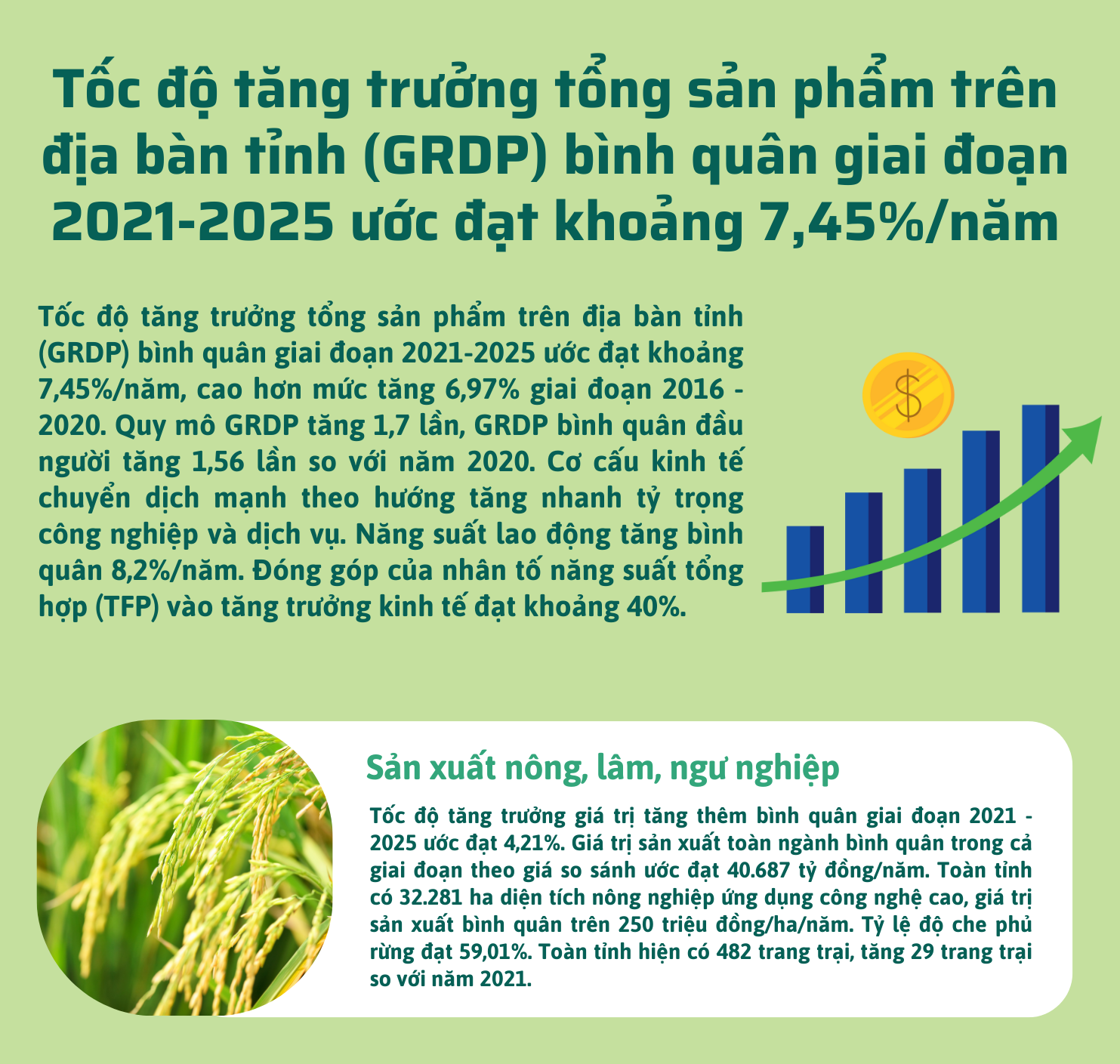 [Infographics]: Tốc độ tăng trưởng tổng sản phẩm trên địa bàn tỉnh (GRDP) bình quân giai đoạn 2021-2025 ước đạt khoảng... -