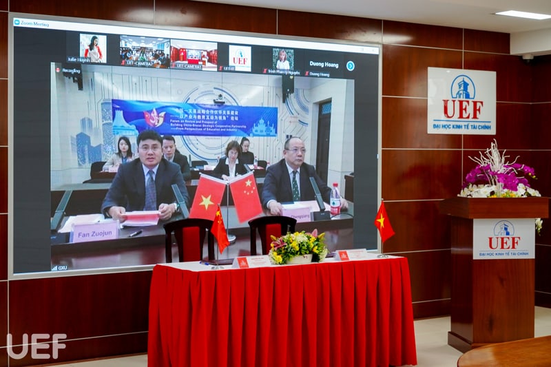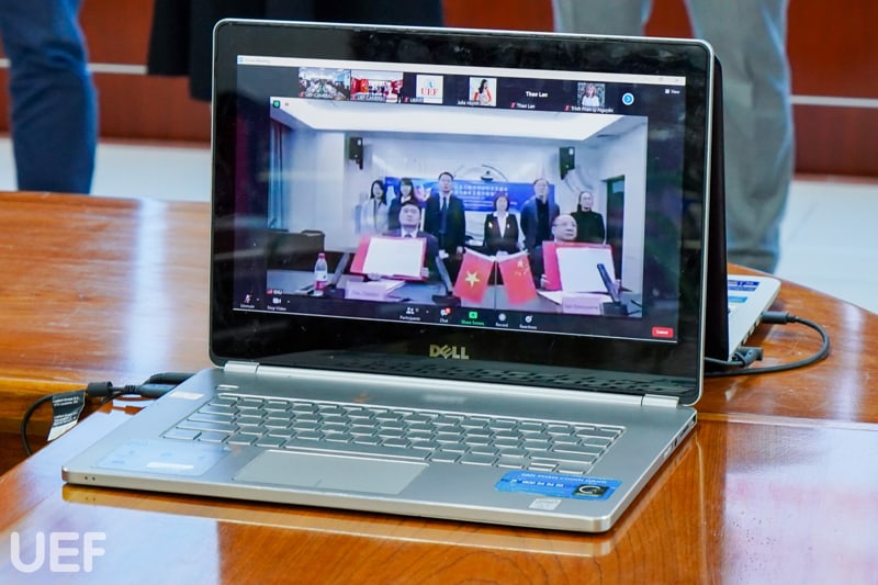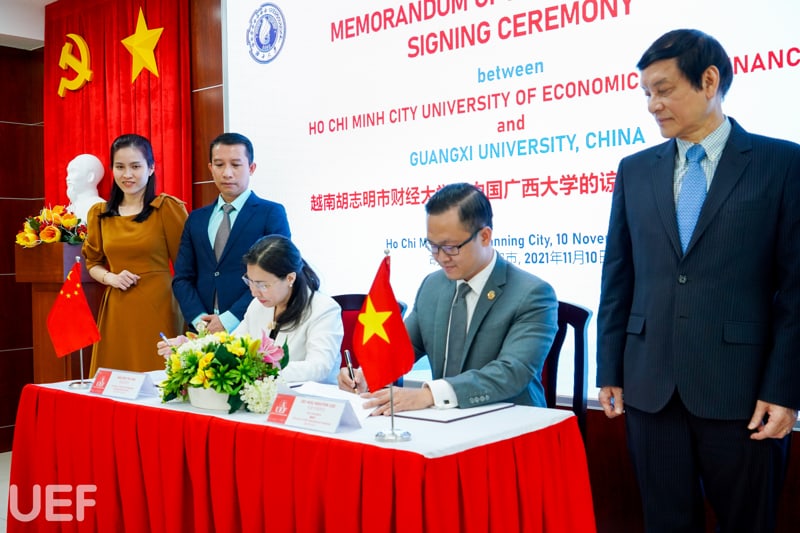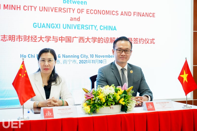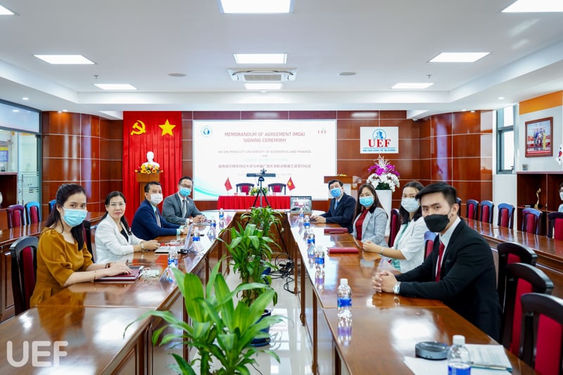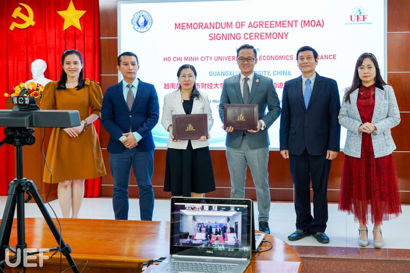 UEF và Đại học Quảng Tây tiến hành ký kết MOA trực tuyến chiều ngày 10/11 Tham dự chương trình, về phía UEF có ông Đỗ Quốc Anh – Phó Chủ tịch Hội đồng trường; TS. Đỗ Hữu Nguyên Lộc – Phó Hiệu trưởng, Viện trưởng Viện Quốc tế; TS. Lý Thiên Trang – Cố vấn Ban Giám hiệu; TS. Võ Văn Thành Thân – Trưởng khoa Ngôn ngữ và văn hóa quốc tế; TS. Nguyễn Thị Lan – Phó Trưởng khoa Ngôn ngữ và văn hóa quốc tế; TS. Phạm Thị Ánh Ngọc và ThS. Huỳnh Tú Anh – Phó Viện trưởng Viện Quốc tế.