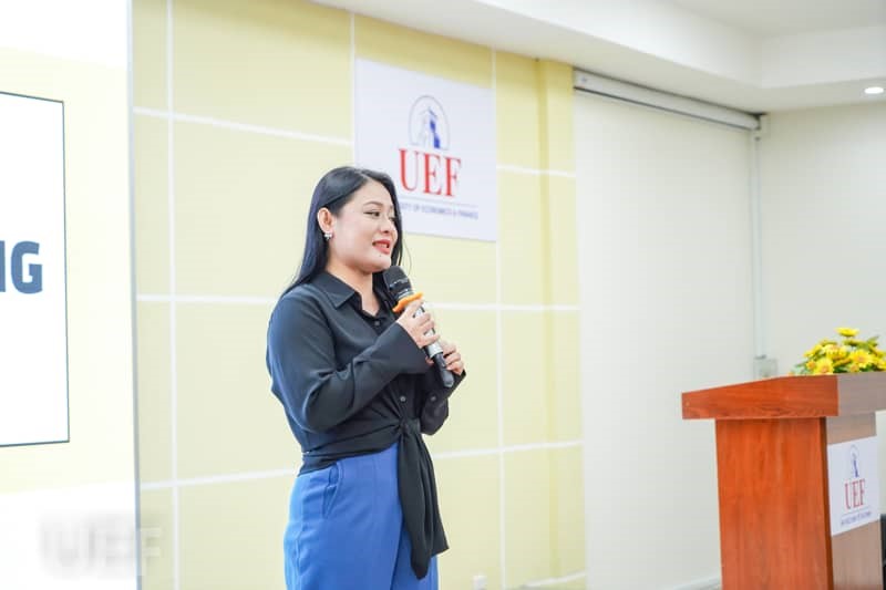 ThS. Nguyễn Huỳnh Sinh nhấn mạnh tầm quan trọng của kỹ năng nói trước đám đông đối với tân sinh viên Chia sẻ về nỗi sợ nói trước đám đông, ThS. Chế Dạ Thảo đã đặt ra vấn đề: Bạn sợ người khác nhìn mình hơn hay sợ người khác không nhìn mình? Hầu hết với những bạn trẻ ngại nói trước đám đông, ai cũng mang cả 2 nỗi sợ này. Diễn giả sau đó lấy câu chuyện chạy đua giữa Rùa và Thỏ để truyền tải thông điệp. Tuy thua cuộc, Thỏ trước đó đã chủ động thách thức Rùa chạy đua vì Thỏ biết được thế mạnh của mình là gì, đây cũng là điều người nói trước đám đông cần có, hiểu thế mạnh và sân chơi của mình ở đâu. Đối với Rùa, ngay từ đầu đã có lợi vì Rùa có chiến lược, thắng hay thua đều lan tỏa câu chuyện tích cực. Nói trước đám đông cũng vậy, diễn giả nhấn mạnh kỹ năng này cũng cần có chiến lược. Kỹ năng nói trước đám đông mang mục đích là truyền tải thông tin và tạo sức ảnh hưởng cá nhân, vì vậy nội dung nói, tác phong, thái độ, ngôn ngữ hay sự kết nối đều rất quan trọng. Chị Dạ Thảo cũng đã làm rõ những yếu tố này để các bạn hình dung rõ hơn.