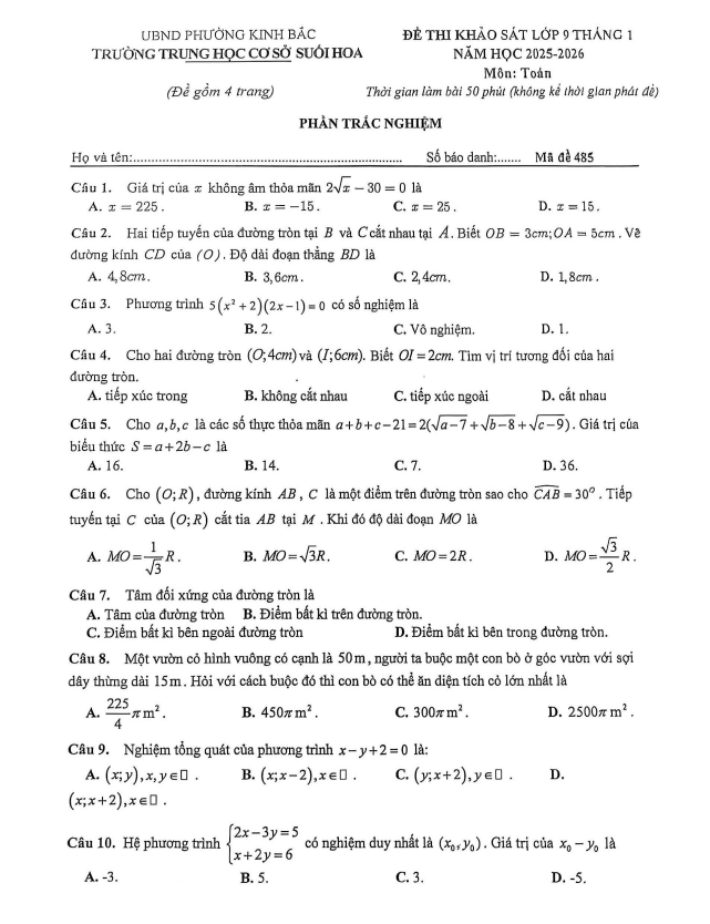Đề khảo sát Toán 9 tháng 1 năm 2026 trường THCS Suối Hoa – Bắc Ninh 25/01/2026