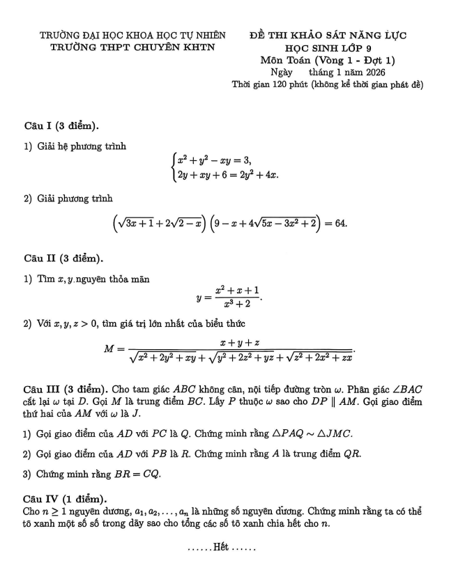 Đề khảo sát Toán 9 vòng 1 đợt 1 năm 2025 – 2026 trường chuyên KHTN – Hà Nội 25/01/2026