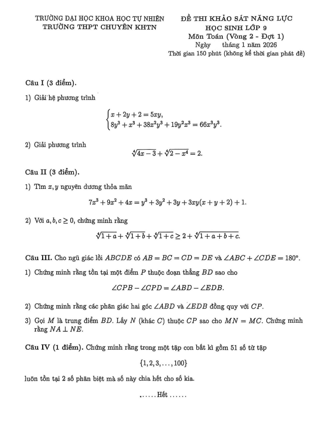 Đề khảo sát Toán 9 vòng 2 đợt 1 năm 2025 – 2026 trường chuyên KHTN – Hà Nội 25/01/2026