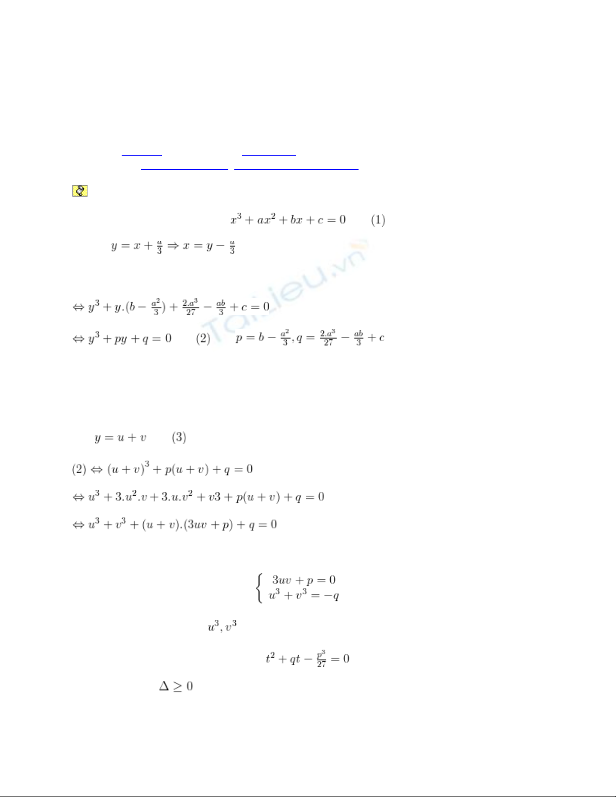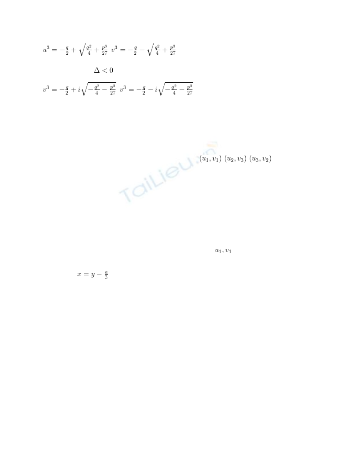, Trng hp 2:ườợ .Ta có:, (5)Ta xét trng hp 1 (trng hp 2 xét tng t) Khi đó có 3 giá tr u và 3 giá tr v tha mãnườợườợươựịịỏphng trình (5):ươ, (6) Ta chn u,v tha mãn phng trình (4). Ln lt th các cp giá tr (u, v) vào phng trìnhọỏươầượếặịươ(4), ta nhn thy ch có 3 cp giá tr tha mãn. Đó là: ậấỉặịỏ, , Th 3 cp (u, v) trên vào biu thc (3) ta có 3 giá tr y tng ng và đó là nghim caếặởểứịươứệủphng trình (2).ươHay:(*)Vy phng trình (2) đc gii nh công thc (*) vi ậươượảờứớđc xác đnh t công thcượịừứ(7).Do đó, th ếta có đc công thc nghim tng quát ca phng trình (1). ượứệổủươ Tài liệu liên quan