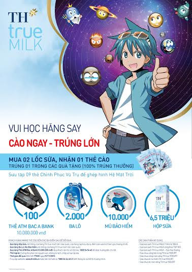 Cụ thể, khách hàng mua 02 lốc sản phẩm bất kỳ được áp dụng chương trình này bao gồm Sữa tươi sạch tiệt trùng TH true MILK 110ml & 180ml; Sữa tươi công thức TOP KID; Sữa tươi học đường Shool MILK; Sữa chua uống tiệt trùng; Sữa chua uống men sống; Sữa chua ăn tự nhiên; Sữa chua ăn men sống TH true YOGURT, sẽ nhận một thẻ cào may mắn 100% trúng thưởng một trong các phần quà như: 6,5 triệu hộp Sữa TH true MILK 180ml, 2.000 ba lô cao cấp, 10.000 mũ bảo hiểm, 100 thẻ ATM Bac A Bank trị giá 10 triệu đồng/thẻ.