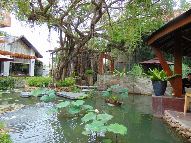 Cũng nên nhắc đến không gian ngoại thất của cà phê Như Ý trên một hẻm đường 30.4 từ trung tâm ra Mít Một. Quán ấy là của một cô hoạ sĩ trẻ phải đi xe lăn, nhưng ý tưởng sáng tạo thật phong phú, qua các đường nét trau chuốt thể hiện làng quê Việt- giếng gạch, cỏ non, lu nước… và những ngôi nhà ngói cũ thâm nâu. Quán mới ra nhất gần đây lại thật dễ tìm, vì ngay trên đường Trưng Nữ Vương lối xe đi Thành phố. Đấy là Sen Đá, vì hồ nước ở đấy rõ ràng như chỉ có sen giữa lô xô đá. Sen trắng, sen hồng nổi bật trên nền nước trong thẫm đen. Phụ hoạ thêm là những tấm đá được cắt xẻ thành các hình thù đầy ngẫu hứng.