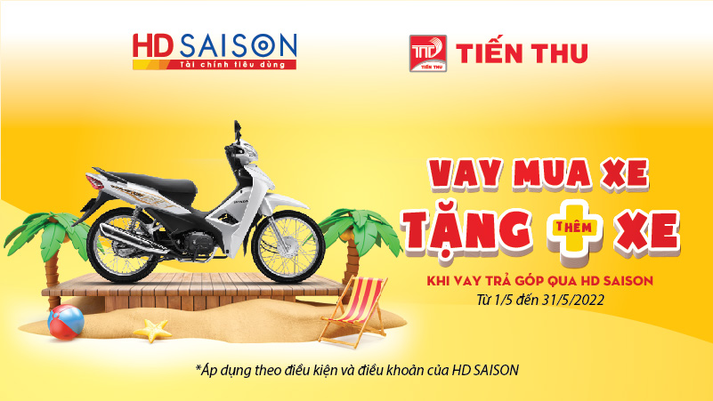 Chào tháng 5 rực rỡ, tất cả Khách hàng vay mua xe máy tại Hệ thống cửa hàng Tiến Thu qua hình thức trả góp với HD SAISON đều có cơ hội được tặng thêm xe máy được từ chương trình "Vay mua xe - Tặng thêm xe".