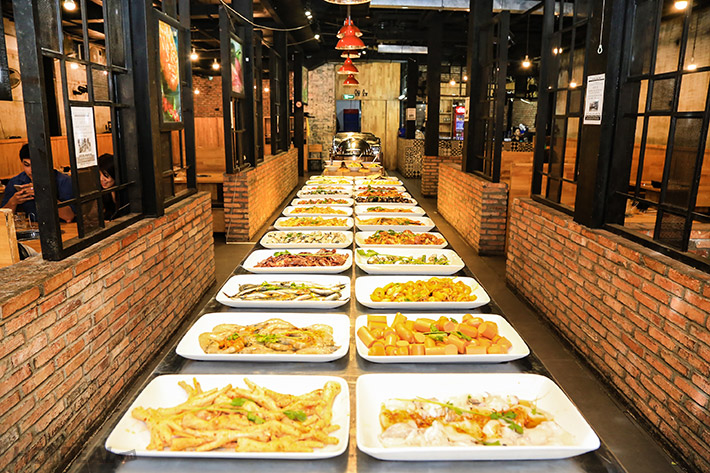 - Thức ăn được bày trí đẹp mắt và để gần khu vực cửa ra vào, tạo cho thực khách cảm giác choáng ngộp vì sự phong phú của các món ăn.