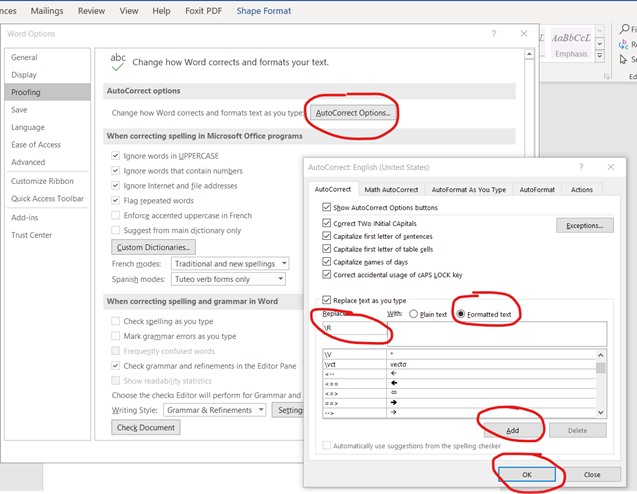 + Vào File/Options/Proofing/AutoCorrect Options rồi chọn thẻ AutoCorrect, đảm bảo chọn nút Formatted text. Ở ô Replace bạn gõ \R, bấm add rồi OK (hình dưới đây).